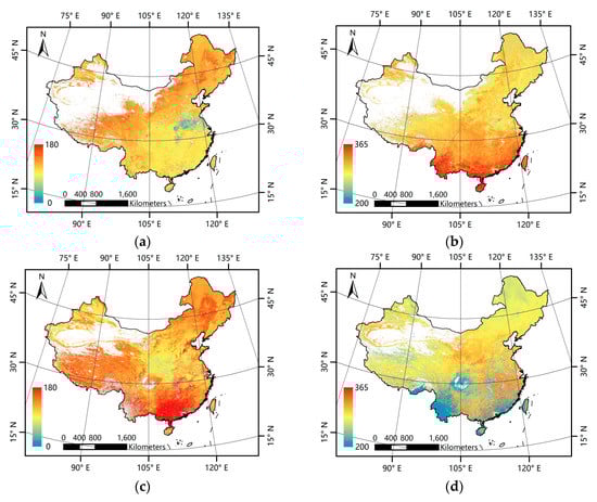 Figure 3a–d presents the mean phenological metrics for China for the 2001–2012 period derived from the GLP and MLCD data. In general, the GLP and the MLCD have consistent patterns in the north of China, but inconsistent patterns are exhibited in the south. For both the GLP and the MLCD, the missing data exist inevitably and vary in different regions.