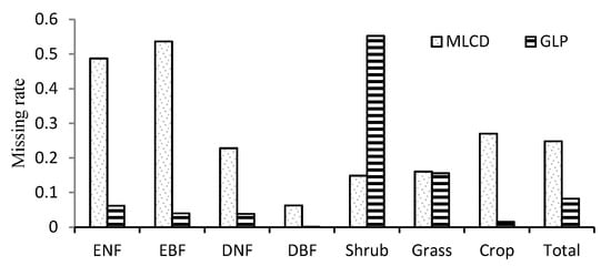In general, the ratio of missing data is 8.3% for the GLP, which is obviously less than the 22.8% for the MLCD, as shown in Figure 4. The missing ratios of the MLCD and the GLP differ obviously over different vegetation types. For the MLCD product, the missing ratio is highest in EBF (53.6%), followed by ENF (48.73%), which is much higher than that of GLP (6.2% and 4.0% respectively). Nevertheless, the missing ratio of shrub is the highest for GLP (55.3%), which is higher than that of MLCD (14.9%). In addition, the missing ratio of MLCD in crop is relatively high, especially for the double-cycle crop in the North China Plain (Figure 2); invalid results are also treated as missing data.