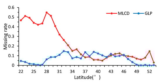 As shown in Figure 5, the patterns of the missing ratios depend strongly on the latitude between 22° N and 53° N in China. In general, the missing ratios of the MLCD are higher than those of the GLP along each latitude zone except from 37° N to 43° N. The missing ratio of the MLCD gradually decreases as the latitude decreases, especially in midlatitude zones (30° N–53° N), and remained inordinately high between 22° N and 30° N (approximately 50%), where much data are missing in the Sichuan Basin (as shown in Figure 2). However, the missing ratio of GLP largely depends on desert vegetation. For the GLP, the latitudinal distribution of missing data is consistent with the distribution of grass or shrub, as shown in Figure 5 and Figure 6.