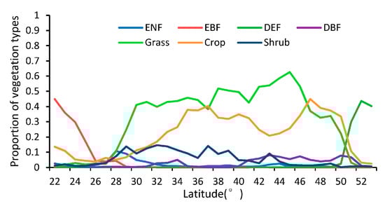 The nadir BRDF-adjusted reflectance (NBAR) data from MODIS (MCD43A4) were used to compute the EVI, as shown in Equation (2). The MODIS-EVI products and the GLASS-LAI products were used to compare the difference of vegetation growing states reflected by the LAI and EVI time series. Besides, the land cover type (MOD12Q1) was downloaded from NASA’s Earth Observing System Data Center website. The MOD12Q1 was used to identify the land cover type over pixels, as shown in Figure 2.