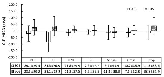 Specifically, the difference between the GLP and the MLCD varies among different vegetation types, as shown in Figure 7. Overall, the SOS of the GLP is earlier than that retrieved by the MLCD in most vegetation types, while the EOS of the GLP is later, including shrub. Among the vegetation types, the difference between the GLP and the MLCD in deciduous broadleaved forest is the smallest, among which the difference in SOS is smaller than that of EOS (the means and standard deviations are −7.2 ± 17.7 and 5.5 ± 36.5, respectively). The greatest difference occurs in evergreen broadleaved forest, among which the difference in SOS is larger than that of EOS (the means and standard deviations are −84.3 ± 76.5 and 38.1 ± 73.3, respectively). In addition, the difference in SOS or EOS between the GLP and the MLCD in croplands is relatively large (the means and standard deviations are −14.5 ± 53.6 and 38.8 ± 61.9, respectively), as double-cycle crops are poorly detected in MLCD.