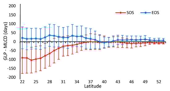 Obviously, the differences between the GLP and the MLCD become stronger as the latitude decreases, as shown in Figure 2 and Figure 8. The difference between the GLP and the MLCD largely depends on different vegetation types. The greatest difference between the GLP and the MLCD is found below 26° N, where EBF is mainly distributed. As the ratio of EBF decreases, the difference decreases. Because DBF is mainly distributed above 40° N, the difference between the GLP and the MLCD become small above 40° N. The difference in the SOS below 40° N is larger than that in the EOS, and the differences in the SOS and the EOS are similar above 40° N.