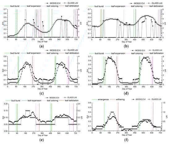 The LAI and the EVI of shrublands are relatively lower. Although the range of seasonal variation of the EVI time series is smaller than that of the LAI, the precision of the current LAI products is 0.1, which is easier for presenting the “ladder” time series than the EVI product, whose precision is 0.01. Thus, the EVI shows the subtle dynamic changes of grasslands more clearly. As shown in Figure 9e, the inflection point of the EVI time series is close to bud burst and leaf defoliation of shrub. When using the LAI, it is difficult to show the subtle dynamic changes, causing a time offset in shrub phenology. Especially for shrubs in desert, the ranges of the seasonal variations in EVI or LAI are so small that the logistics model is difficult to fit to extract phenological information.