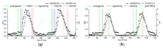 For croplands, although the LAI start to increase earlier than the EVI, the EVI is more sensitive to vegetation growth than the LAI during the greenup. Therefore, he EVI generally reaches maturity faster than the LAI, but the peak of the LAI time series is closer to the ground observations, as shown in Figure 9g,h.