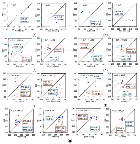 For deciduous forests, the accuracy of GLP or MLCD for SOS is higher than that for EOS, as shown in Figure 10c,d. The SOS of MLCD in DBF is very close to the 1:1 line, suggesting that the SOS that extracted by EVI is in good agreement with ground observations. Specifically, the MAB of the MLCD for the SOS is 4.1 days (MB = −1.9 days), and the MAB of the GLP for the SOS is 9.0 days (MB = −8.5 days). The EOS of GLP is later than that of MLCD, and their MABs are 22.9 days and 17.3 days respectively.