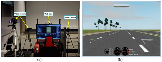 Data collection was performed in a simulator-based driving environment, developed in collaboration with the Malaysian Institute of Road Safety Research (MIROS). An illustration of the experimental setup is shown in Figure 1a. Simulator-based environments were chosen over real driving conditions, because of the risks and ethical implications of allowing subjects to drive in a state of drowsiness. A monotonous driving environment was created as shown in Figure 1b to induce drowsiness in the driver naturally, as these concepts has been used in the literature [10,36].