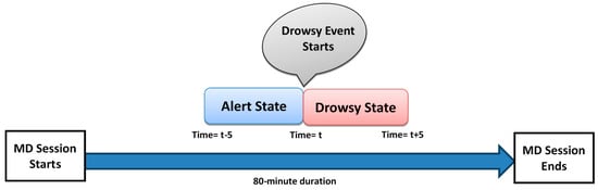 Not all subjects exhibited signs of drowsiness, so only data from drowsy subjects were used for analysis. Eleven out of 22 subjects became drowsy during the experiment. The 5-min period prior to a drowsy event was used as data to represent the alert state, while the 5-min period after a drowsy event was used as data to represent the drowsy state, as shown in Figure 2.