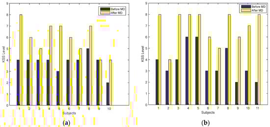 KSS rating levels at the start and the end of the MD session were analyzed to study the effects of drowsiness on subjective ratings. For this purpose, data was divided into two groups: the alert group (subjects who were alert throughout the driving session); and the drowsy group (subjects who exhibited drowsiness during the driving session). The KSS rating levels of both groups are shown in Figure 3a,b for the alert and drowsy groups, respectively. Figure 3b shows that the drowsy group exhibited higher KSS ratings at the end of the MD session compared with the start (before MD), when they were alert. However, the alert group (Figure 3a) also showed a similar pattern to the drowsy group (Figure 3b), comparing the data before and after MD.