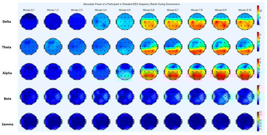 Time domain analysis of EEG data does not provide detailed information about the activation of brain regions during a particular activity (i.e., which brain regions are activated during drowsiness, which frequency bands are activated in drowsiness) and their association with human physiological states. Therefore, we performed frequency domain analysis of the EEG data, which includes absolute power and relative power across all EEG channels and frequency bands.