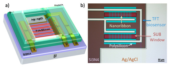 (a) Three-dimensional representation of the TFT nanoribbon biosensor; (b) Microscope picture of the TFT nanoribbon biosensor.