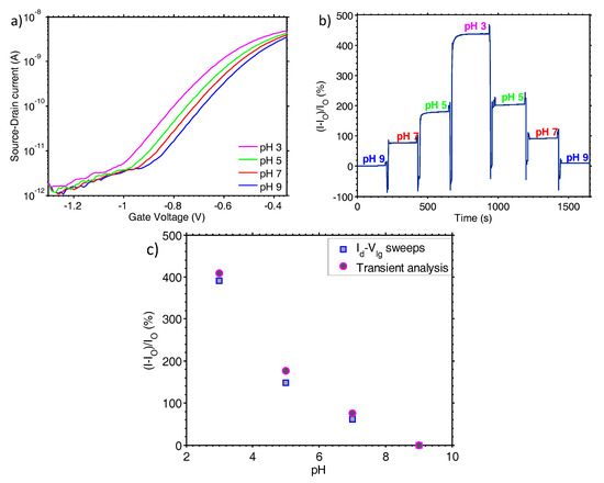 (a) Id-Vlg characteristic curves of the nanoribbon biosensor for a range of pH 3 to pH 9; (b) Normalised percentage drain current change of the biosensor for a range of pH from 3 to pH 9; (c) Nanoribbon biosensor pH sensitivity extracted from the Id-Vlg characteristic curves and transient measurements.