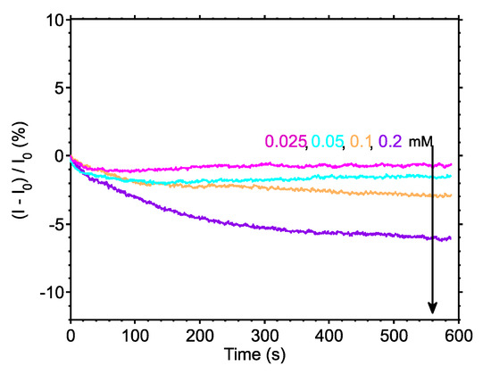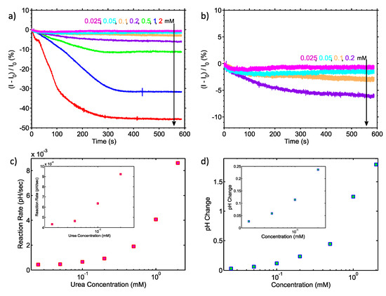 Figure 3c shows the reaction rate extracted from the results presented in Figure 3a,b, demonstrating that the reaction rate increases with increasing concentration, as expected. Moreover, Figure 3d shows the endpoint of the reactions, extracted from the results of Figure 3a and then converted to an equivalent pH change using the calibration data of Figure 2c. These data show that the system is capable of measuring minute pH changes, with the smallest concentration of urea (0.025 mM) giving a 27 mpH change.