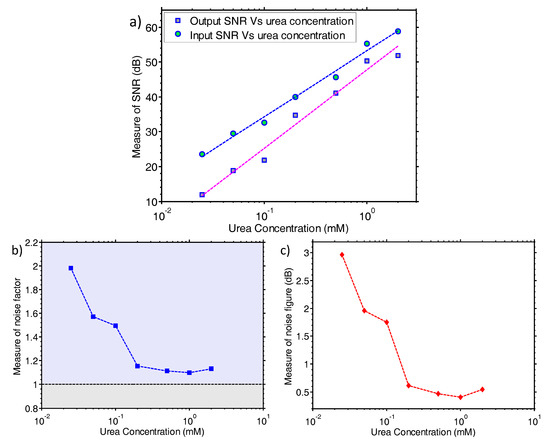 Noise analysis of the proposed system. (a) System input and output measure of SNR plotted against urea concentrations; (b) Measure of noise factor of the system vs urea concentrations; (c) Measure of noise figure of the system vs urea concentrations.