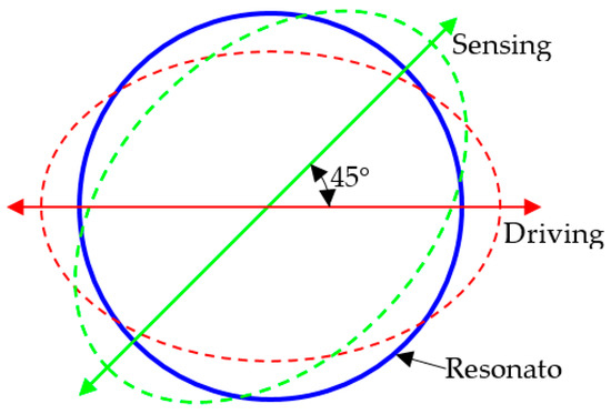 The schematic diagram of the working principle is shown in Figure 2. When an alternating voltage is applied to the piezoelectric electrodes that coincide with the driving mode, for the converse-piezoelectric effect, the piezoelectric electrodes contract and expand, which produce an alternating bending moment on the resonator, hence the resonator is induced into a circle-ellipse flexural vibration in the driving mode at the frequency of the alternating voltage. To achieve the maximum amplitude of vibration, the frequency of the excited voltage should be consistent with the eigenfrequency of the driving mode, which is easily achievable by controlling the power supply.