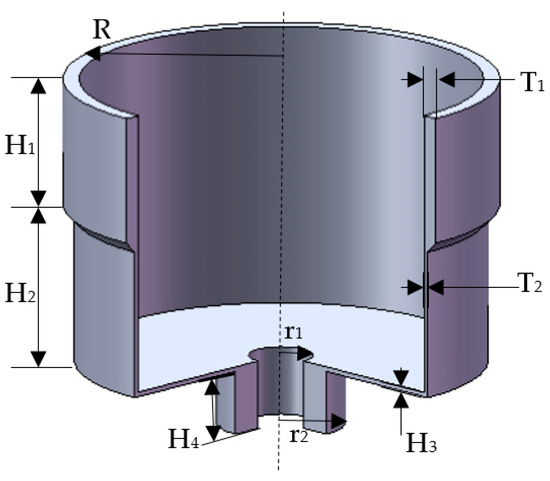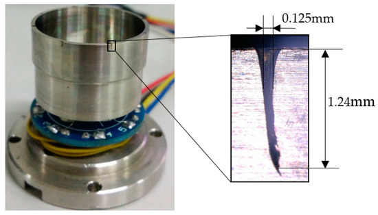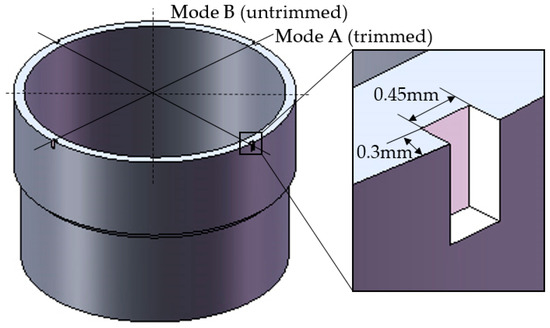 Grooves-trimming is shown in Figure 6; four 0.3 mm × 0.45 mm grooves are formed on the top edge of the resonator wall.