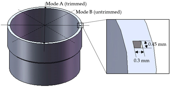 A cylindrical shell vibrating gyroscope is a kind of solid-state wave gyroscope which senses angular velocity based on the inertial effect of the standing wave in a cylindrical shell resonator, and it has the advantages of a simple structure, high operational accuracy, low cost, and long life [1,2]. Therefore, these advantages render the cylindrical gyroscope useful in numerous applications such as avionics systems, borehole surveying, missiles, naval equipment, platform stabilization, and robotics [3]. However, in order to achieve these advantages, a precise resonator, which is susceptible to unavoidable fabrication errors, is necessary [4]. Hence, the resonator trimming after fabrication is of great importance to improving the performance of gyroscopes.