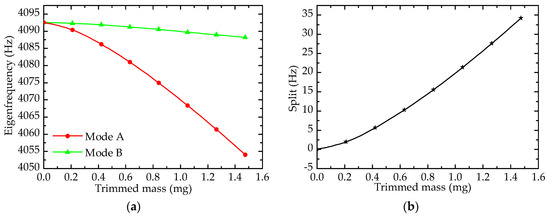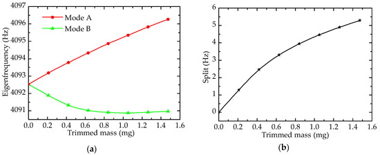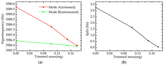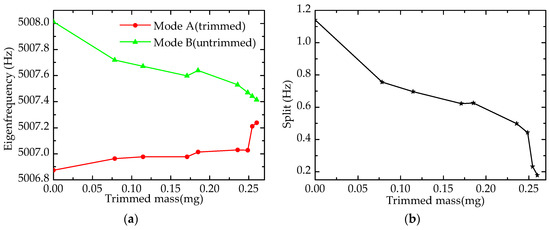 Simulation results of trimming process: (a) Eigenfrequency; (b) Frequency split.
