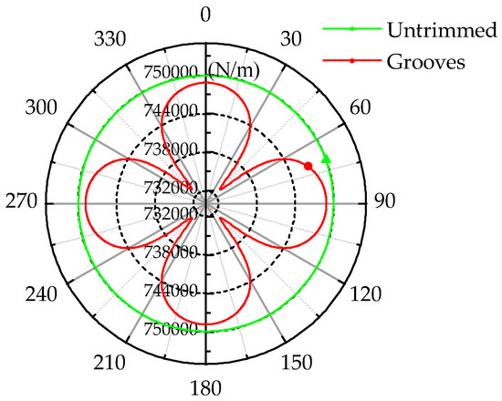 After stating the variation of eigenfrequency under grooves-trimming, it is necessary to research the rigidity variation under the same case. Equivalent radial rigidity is force over radial deformation, and deformation is produced by exerting force along the diameter of the wall of the resonator. The radial rigidity condition of the resonator (with a depth of grooves of 1 mm) is illustrated in Figure 8, which is the result of our simulation, and it displays the rigidity of untrimmed and grooves-trimmed resonators.