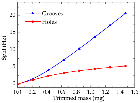 According to Figure 10, the changing trend of holes-trimming is also in good agreement with the effect rules mentioned above. The sensitivity of holes-trimming is smaller than that of grooves-trimming, as shown in Figure 10b clearly. Holes-trimming is processed on mode B after grooves-trimming, and it only reduces the split by 1.838 Hz when the trimmed mass is also 0.421 mg (from 0.421 mg to 0.842 mg). In this way, the frequency split can be eliminated rapidly and precisely.