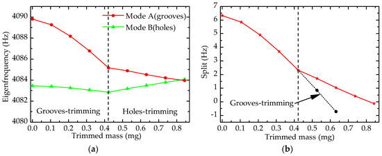 As shown in Figure 10, the changing trends of eigenfrequency and frequency split are presented, and the curve on the left of the dashed line is the trend of grooves-trimming while the right is the trend of holes-trimming. On the left in Figure 10a, eigenfrequencies of both mode A and mode B decrease, and the eigenfrequency of mode A decreases significantly, which coincides with the effect rules of grooves-trimming. After trimming 0.421 mg by the grooves-trimming method, the frequency split deceases from 6.330 Hz to 2.319 Hz (decrease by 4.011 Hz). As shown in Figure 10b, the change trend on the left is more and more sharp, indicating that the efficiency of grooves-trimming increases gradually. In this case, trimming equipment with high-precision is demanded in practice to realize precision trimming, which would increase the cost of fabrication. Therefore, holes-trimming is employed.
