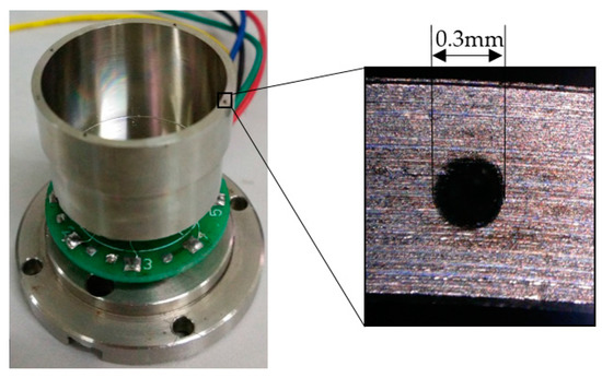 More specifically, fabrication errors always destroy the symmetry of resonator structure, and lead to the splitting of eigenfrequencies and the offsetting of eigenmodes, which is the reason for quadrature error in the gyroscope [5]. Meanwhile, the offset of eigenmodes is significantly affected by frequency split [6]; therefore, eigenfrequency becomes the key factor in improving the performance of gyroscopes. Electrical and mechanical balancing are two common trimming methods used to eliminate the frequency split. Electrical balancing methods can only regulate the eigenfrequency on a small scale [7,8], whereas mechanical balancing can eliminate large frequency split. Conventionally, mechanical balance, such as drilling holes on the button and grooving on the top of the resonator [9], changes local stiffness and mass distribution remarkably to rapidly reduce frequency split. In addition, frequency split could be eliminated by removing masses at pre-selected locations around the resonator, and the magnitude of the trimming masses can be calculated easily [10,11]. Another kind of trimming principle aimed at the variation of mass and rigidity has been presented [12], and trimming holes and grooves on the resonator have been shown to be effective, precise, and viable methods. Under these trimming methods, stress effects under varying temperature [13], Q factor [14], and node position [15] are studied. However, studies on the effects on eigenfrequency after trimming are rare; therefore, this paper focuses on eigenfrequency. On the other hand, the trimming tool employed is also important in the trimming process. For a thin cylindrical wall, mechanical drilling and milling causes large deformation, residual stress, and high cost, and previous methods that trim holes on the bottom plate [2,6,9] have aimed at reducing these disadvantages. Laser ablation does not deform the resonator, but causes thermal stress, whereas femtosecond laser results in a lower thermal stress [16,17]. The advantages of femtosecond lasers for precise material processing are discussed and demonstrated in References [18,19], which guarantee the trimming of a tiny material. Hence, femtosecond laser is employed in our experiment to reach a high processing accuracy.