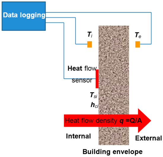 Following Equation (1), the ISO 9869: 2014 [26] standard for measuring the U-Value (see Figure 1) requires two temperatures sensors and one heat flow metre on the side with the most stable temperature, usually indoor. The heat flow sensor (thermopile) should be in direct thermal contact with the surface of the envelope (usually a wall) over the whole area of the sensor. Regarding the temperature sensors, they must measure the surrounding air temperature (not the envelope surface temperature).