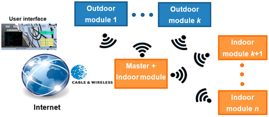 The U-Value metre design is fully modular and also its use. It is made up of different modules that the user can configure according to his/her need (Figure 2). The indoor and outdoor modules are physically separated but connected via wireless. All modules function as Xbee devices using Zigbee protocol [33,34].