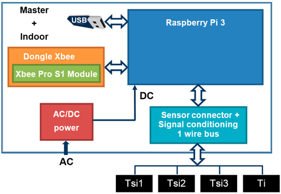 The block diagram of the Master + indoor module is shown in Figure 3. It is based on a small single-board computer Raspberry Pi 3 [13,37]. In addition to the Raspberry Pi 3, the master + indoor module has a built-in Dongle Xbee + XBee device (Xbee S1 Pro, [38]), an AC/DC power supply, and a board were the temperature sensors are connected. It allows connecting the 1-wire bus used with the temperature sensors (for measuring Ti, and 3 Tsi) to the Raspberry. Finally, although the measures can be transmitted in real time to any point with Internet connection, these are also stored in an external USB memory device (32 GB in this prototype), which allows for measure recovery if any communication failure occurs. This USB memory device can be removed by the user.
