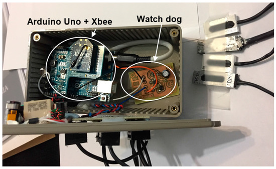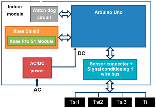 In addition to the Arduino Uno, the indoor module has built-in a Shield Xbee + XBee device (Xbee S1 Pro), a watch-dog circuit (automatically resets the module in the event of communication blocks, which occurs with certain frequency in these devices), an AC/DC power supply, and a board where the temperature sensors are connected. It allows connecting the 1-wire bus used with the temperature sensors (for measuring Ti, and 3 Tsi) to the Arduino Uno.