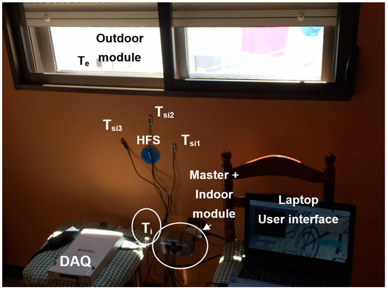 Once the retrofitting process has completed, we configured the experimentation scenario shown in Figure 9. This involved two tasks: (a) measuring U-Value improvement, and (b) comparing both U-Value measure methods, i.e., through the direct heat flow measurement (2) and through the three temperatures measurement with the developed metre Equation (7). For carrying out this experiment it was necessary to synchronise both metres, which was carried out in the laptop; in this way all temperatures were the same for both metres.