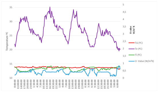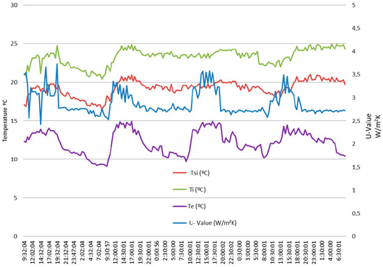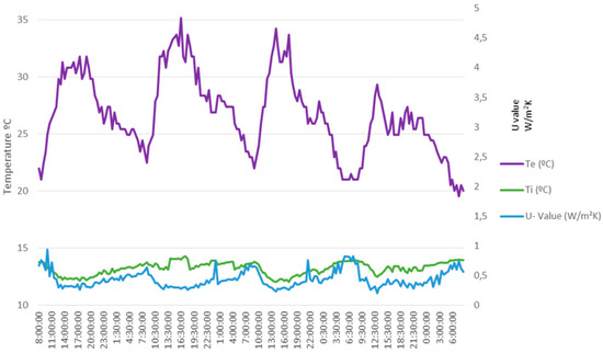At this point, it is interesting to point out a very important feature of the developed system. As already established in Section 2, steady-state condition (necessary for measures to be valid) means that the average U-Value remains substantially constant over time. For this reason and as a precaution, the standard establishes a measurement time of at least 3 days, however in some cases this time may be insufficient. Where is the key then? Precisely in knowing whether the steady-state has been reached or not. If it has been reached the test can stop, if not the test must continue until it is reached. This way of facing the problem is novel and from our point of view very interesting, since it supposes the duration of test that in general will be different for each case; what is the duration then? It is strictly the necessary.