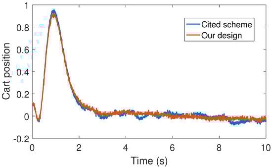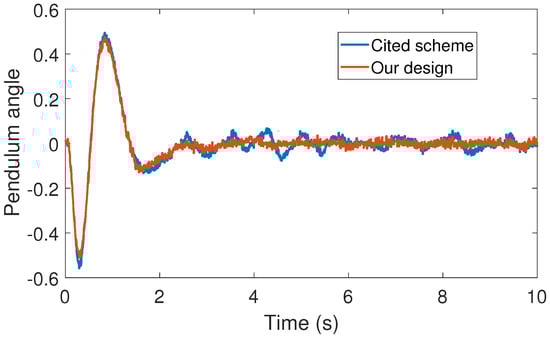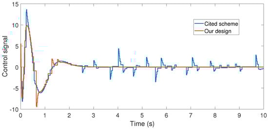 With the above data, the Theorem 1 requirements are satisfied. In our design, we use with plant initial condition ; where , and are the cart and pendulum position and angle displacement, respectively. The remaining initial conditions were set to zero. For oddity, we employ . For comparison proposes, we program the event-triggered controller based on observer design stated in [3,7], and we called it the Cited scheme. According to the numerical experiments shown in Figure 3 and Figure 4, our design presents better performance. Moreover, Figure 5 shows the corresponding generated control signal; we can again note an improvement in the control energy required to satisfy the regulation control objective of the mechanical system under study. Moreover, Figure 6 shows the triggering moments for each experiment, where we can observe that the Zeno behavior is missing for both cases. Furthermore, by adding white noise to the output plant equation with mean zero and variance , the noisy sensor measurements for performance evaluation are shown in Figure 7, Figure 8, Figure 9 and Figure 10. From these figures, we can again note the better performance of our design. Additionally, the noisy case is not studied in the relevant cited references [3,7]. Lastly, from the given numerical results, specifically from Figure 3, Figure 4 and Figure 5, our control design requires less control effort to achieve better results in comparison to the cited design. This may be evidence of the advantages of our approach.