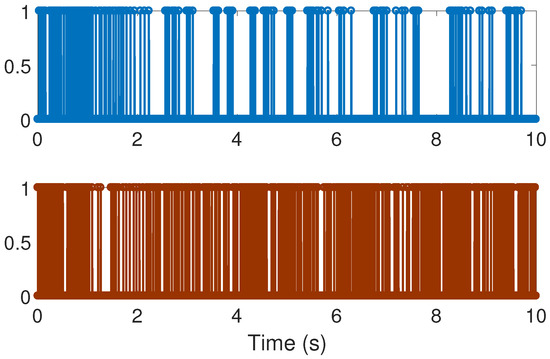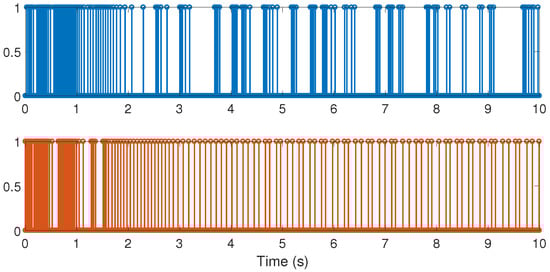 where is the time-constant of the filter and is a non-uniform square signal taking values from the set . In this way, when , the solution in (16) is held (the filter dynamic is stopped) to the last value of until , where will follow the signal (the filter dynamic is released). It is clear that if is sufficiently large, and the square signal is too narrow when , then the above dynamic is a kind of ideal sampled-and-hold mechanism. In fact, from the circuit point of view, the real sample-and-hold devices use a capacitor which is charged to the sampled value of the signal , which requires a constant-time for charging (equivalent to our case). We use the above ZOH-model system in our numerical experiment realization.