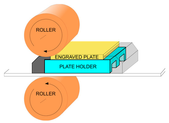 According to the measurements taken by two load cells placed on the shaft ends of the rollers, the maximum force applied to the engraved plate is around 2000 kg. On the other hand, the linear velocity of displacement of the plate holder can vary in a range from 0.10 to 0.28 m/s. The plate holder has been made of a 7075-T7351 aluminum-zinc alloy. As a result, it exhibits a low Young’s modulus of about 72 GPa, providing strain higher than that of other metals such as steel or copper, and a high elastic limit of 400 MPa, which is higher than that of the engraved plate. This fact ensures that the holder plate can work in elastic mode.