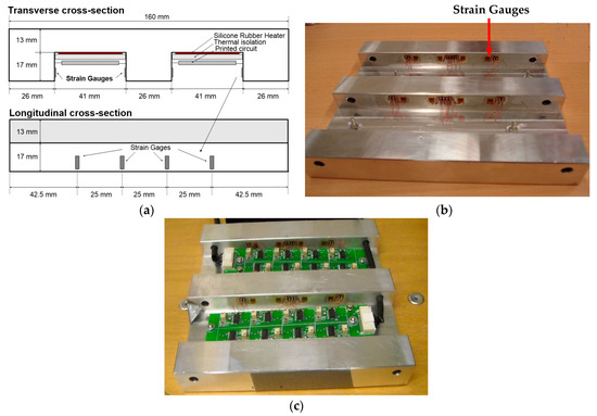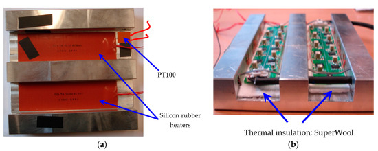 With the aim of raising and regulating the system temperature to 80 °C (see Figure 4a), silicon rubber heaters and a temperature sensor Pt100 have been installed in the grooves together with the printed circuit board that contains the signal conditioning electronics for the strain gauges. To prevent thermal drifts due to the close proximity between the rubber heaters and the conditioning electronics, and therefore, protect the electronic components from damage caused by overheating, thermal fiber (superwool) has been used for insulation of both parts. Despite its minimum thickness, this type of thermal fiber exhibits excellent insulating properties (see Figure 4b).