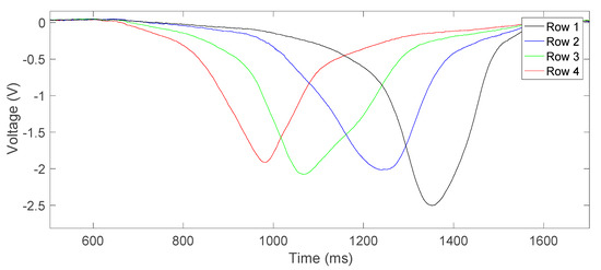 Signal captured from ADS of four consecutive strain gauges (Row 1, Row 2, Row 3 and Row 4) in the same groove. The voltage sign has been changed with respect to the voltages sampled by the ADS with the aim of reflecting the real strain.