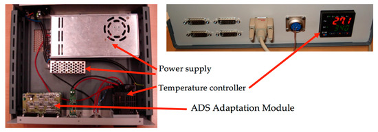 A switch mode power supply unit of 27 V and 200 W is used as a power source for the silicon rubber heaters. Finally, an RS485-to-RS232 converter allows the temperature controller and the PC application to communicate. Figure 6 shows the front and the interior of the device, which incorporates the temperature control system and the ADS adaptation modules.