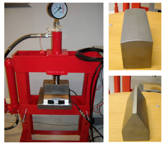 With the aim of verifying the operation of the system, several tests have been conducted. Before performing the tests on the chalcographic printer, a hydraulic press, designed to provide a pressure of 6000 psi, was used as a test bench. Likewise, several tools were developed to exert pressure over the sensor on different points. In this way, the strain gauge deformations were qualitatively measured by using a graph paper template to discover the coordinates of the points on the plate holder where the pressure is exerted. Figure 7 shows the hydraulic press with the sensor system integrated and the tools developed.