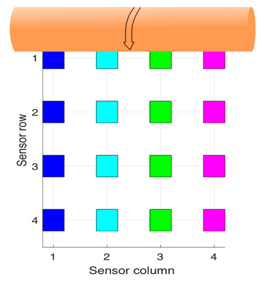 The designed sensor is a custom load cell based on 16 strain gauges arranged in a 4 × 4 matrix configuration. It must be noted that locating strain gauges on the two outermost edges of the engraved plate would be enough to be able to detect the roller misalignment. However, in this work, the four edges have been used with the aim of obtaining additional information. This information can be used to detect potential deformations and the wear of the rollers and the engraved plate, which can produce wrong profiles in the contact pressure.