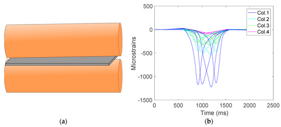 Figure 9a shows the roller position for this test, and Figure 9b shows the deformations caused by the roller and the time when they happen. In Figure 9b, the x-axis represents the time in milliseconds (ms) and the y-axis the deformations (με).