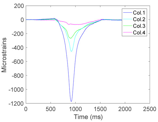 As can be seen in Figure 9, the deformations suffered by each strain gauge on the same column have the same order of magnitude and the maxima happen sequentially in time, synchronized with the displacement of the roller.
