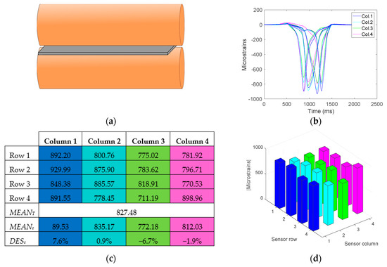 Test with aligned roller. (a) Diagram of the roller position, (b) Strain gauge deformation, (c) Maximum absolute values of the gauge deformations, means and deviations. (d) Representation of the maximum absolute values.