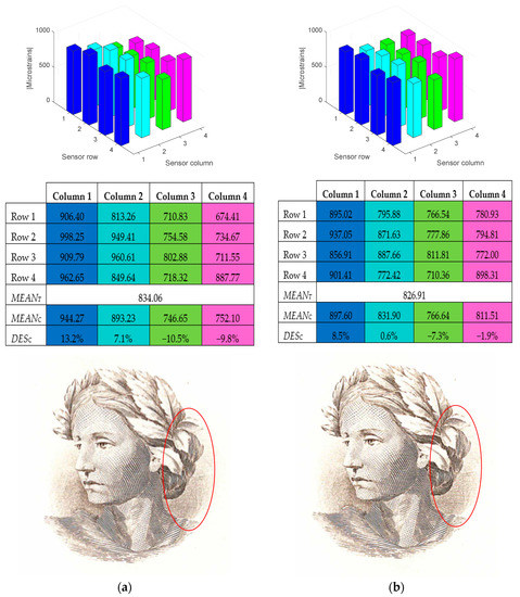 Figure 13a,b shows two examples where an engraving has been made with a roller with slight misalignment and an aligned roller, respectively. The differences are hardly noticeable for a non-expert in the domain of printing techniques, since the roller misalignment is close to the adjustment threshold indicated above. However, the printing expert considers valid the impression on the right (Figure 13b), which allows choosing a value for the adjustment threshold of ±10% for the DESCi parameter, as stated previously.
