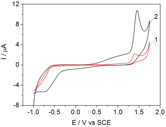 Cyclic voltammograms recorded on boron-doped diamond (BDD) (curve 1) and graphene-modified boron-doped diamond (BDDGR) (curve 2) electrodes in sodium acetate buffer supporting electrolyte and in the presence of 50 μM carbaryl (CR), scan rate 50 mV s−1.