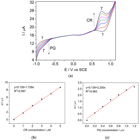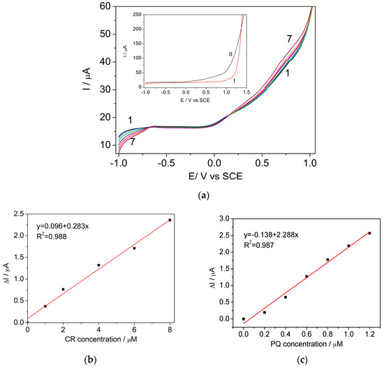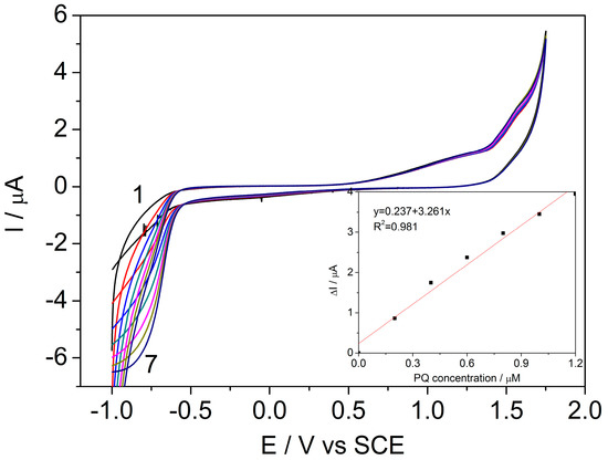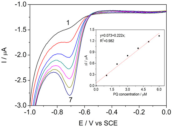 and the modules of cathodic current increased also, linearly at increasing PQ concentration within the concentration range between 0.2 and 1.2 μM. The sensitivity of 46.12 μA μM−1 cm−2 and the limit of detection (LOD) of 10 nM were determined with the good correlation coefficient (R2) (Figure 3, Table 1).