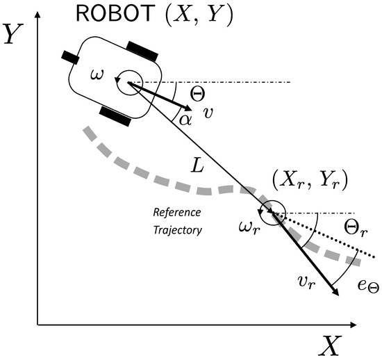 Figure 3 shows the main elements involved in the trajectory tracking problem, where the reference pose is characterized by coordinates and the current pose of the robot by . The time derivative of the pose is related to the linear v and angular velocities according to the robot kinematic model, also valid for reference pose and velocities.