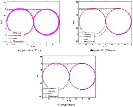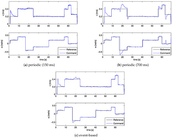 In order to further explain these results, the remaining part of this section presents three representative instances of the performed experiments. Figure 7 shows the trajectory performed in the tests using periodic (with periods and ) and event-based implementation. Although the number of measurements was significantly different, the tracking trajectory in the event-based implementation remained very similar to the periodic case. However, using the same number of updates, in the periodic case (see Figure 7b), the trajectory gets severely distorted, since the controller does not react immediately to changes in the reference.