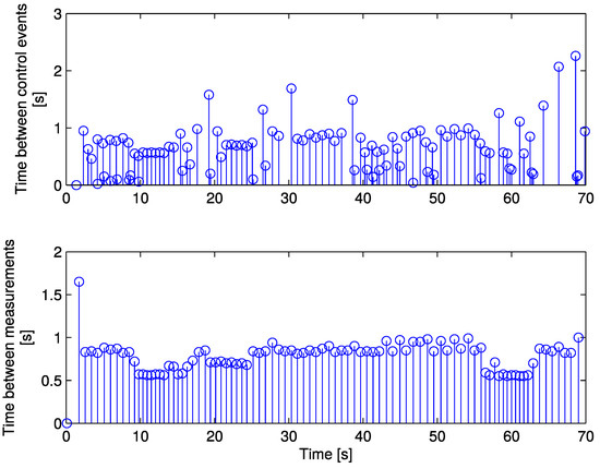 Both sensor and control event times related to the aperiodic case of Figure 7c and Figure 8c are illustrated in Figure 9. Each stem represents an event, where its horizontal position corresponds to the time instant when it occurred, and its height represents the time difference with the previous event.