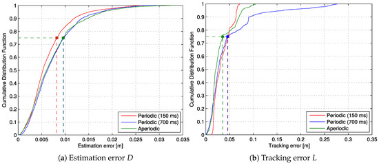 Concerning estimation, the aperiodic implementations showed a slightly higher D than the case. The reason is that the adaptive triggering explained in Section 4 sometimes allows having more uncertainty and fewer measurements as long as it does not cause the tracking performance to deteriorate.