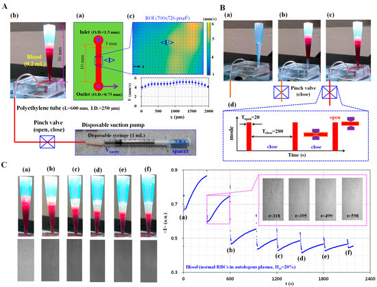 Figure 1 shows the schematics for measurement of RBC aggregation owing to ESR in a pipette tip, under blood delivery with a disposable suction pump. As depicted in Figure 1A, the experimental setup is composed of a disposable microfluidic device with a pipette tip, a disposable suction pump, and a pinch valve (Supa clip, Pankyo, Korea). The microfluidic device is designed with an inlet port, a single microfluidic channel (width = 3 mm, length = 10 mm, and depth = 100 µm), and an outlet port (Figure 1A(a)). To connect with the pipette tip (~1 mL) and polyethylene tube, the inlet and outlet ports have 1.5 mm and 0.75 mm holes, respectively. After cutting approximately 36 mm of a pipette tip, it is tightly fitted into the hole of the inlet port (Figure 1A(b)). After fitting into the hole of the outlet port, the polyethylene tube (inner diameter = 250 µm, length = 600 mm) is connected to the disposable suction pump. The disposable suction pump is composed of a disposable syringe (~1 mL), a specifically sized spacer, and a pinch valve. To secure the cavity volume (Vcavity) of the disposable suction pump, the polyethylene tube is clamped with a pinch valve. After the plunger is sucked outward sufficiently, the specific spacer for the corresponding cavity volume is inserted between the stopper and plunger. After a blood sample (~0.2 mL) is dropped into the pipette tip with a pipette, the blood flow stops or runs in the microfluidic channel by clamping or releasing the tube with the pinch valve.